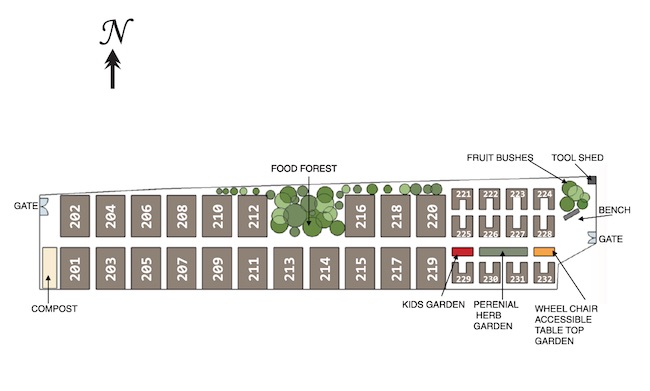 There are 32 garden plots at McLaughlin Meadows. Ground plots are (14’ x 20’) and raised beds (12’ x 12’).